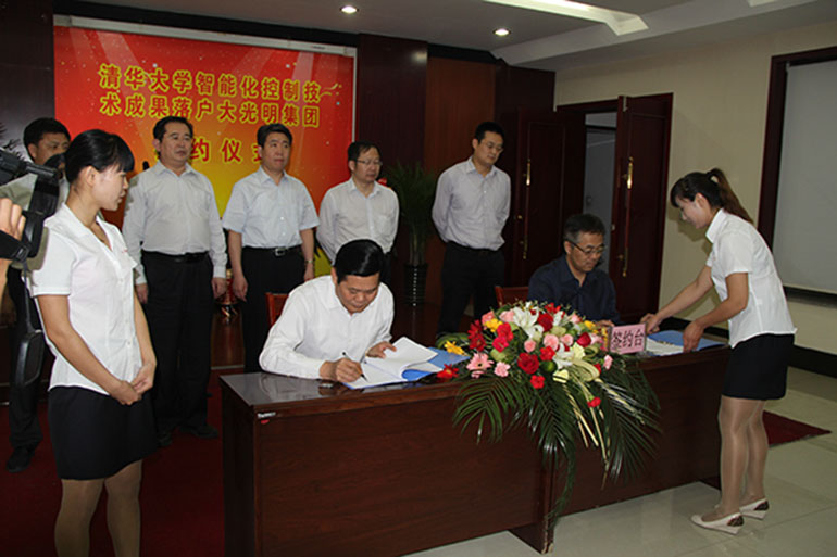 2013年5月15日下午,清華大學(xué)智能化控制技術(shù)成果落戶大光明集團(tuán)簽約儀式在大光明集團(tuán)隆重舉行。沙河市市委書記曲斌、沙河市市長劉果芳出席簽約儀式并見證簽約,沙河市副市長王建江主持儀式。